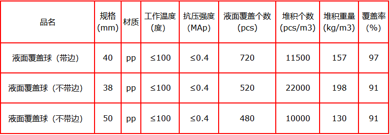 1.液面覆蓋球以聚丙烯pp為原料,經發泡、收縮生產的圓形塑料填料,分帶邊液面覆蓋球與不帶邊液面覆蓋球兩種型號,帶邊液面覆蓋球具有重心穩定,邊與邊重疊,覆蓋效果好等特點,其作用是抑制酸霧揮發,保護操作人員健康,減少大氣污染和空氣對水質的污染,有效提高凝結水質量,有利于發電機組、供熱機組的安全運行。液面覆蓋球經過大量科學實驗,它有效地解決了液面覆蓋技術難題,可保護水質、凈化環境、安全防火、節約能源。產品特點 1.設計精巧合理,外形美觀。選材得當,耐酸耐壓(耐壓0.4MPa,耐酸度為35%濃鹽酸,工作溫度≤100℃)